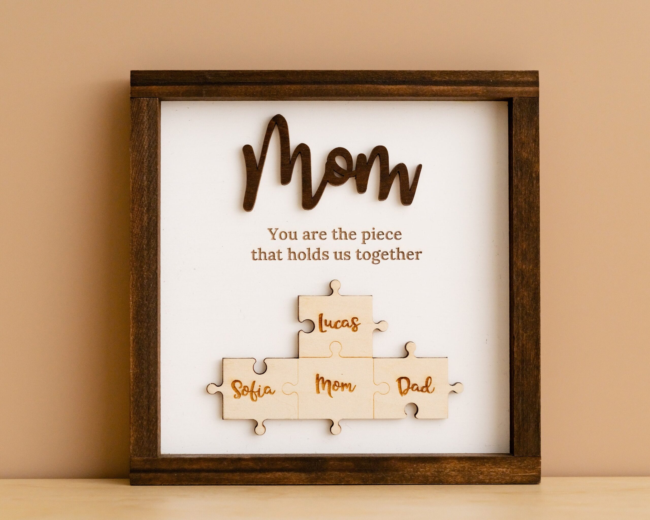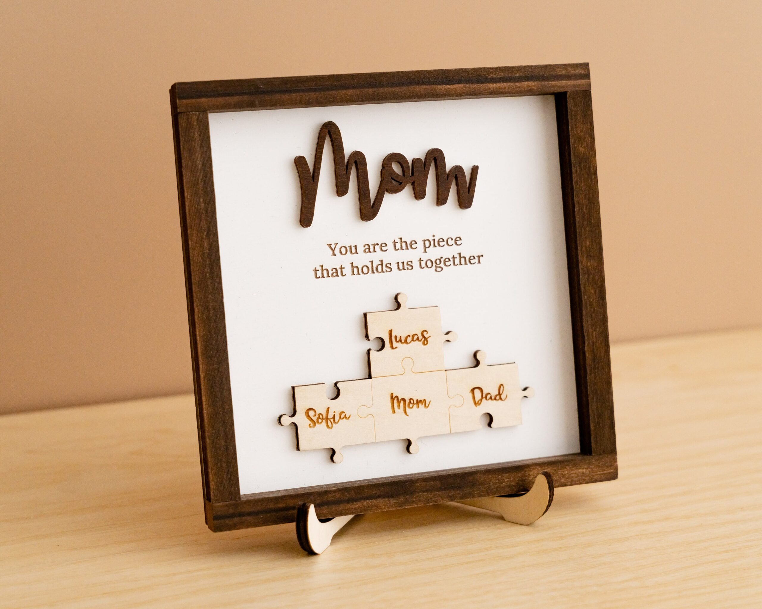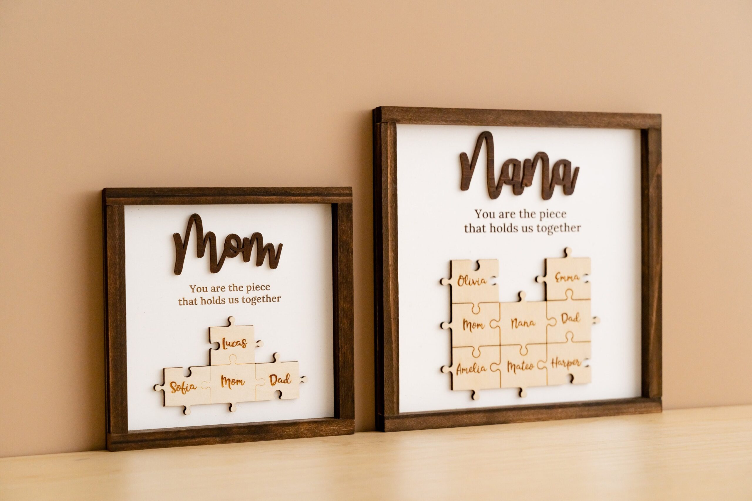 The Mama Puzzle Piece Sign is more than just home décor—it’s a symbol of love, unity, and appreciation. Designed to reflect the powerful role a mother plays in holding her family together, this handcrafted sign combines elegant design with deep emotional value. Featuring a customizable set of puzzle pieces engraved with children’s or family members’ names, this heartfelt piece is ideal for Mother’s Day, birthdays, Christmas, or any time you want to show your gratitude to the matriarch in your life.