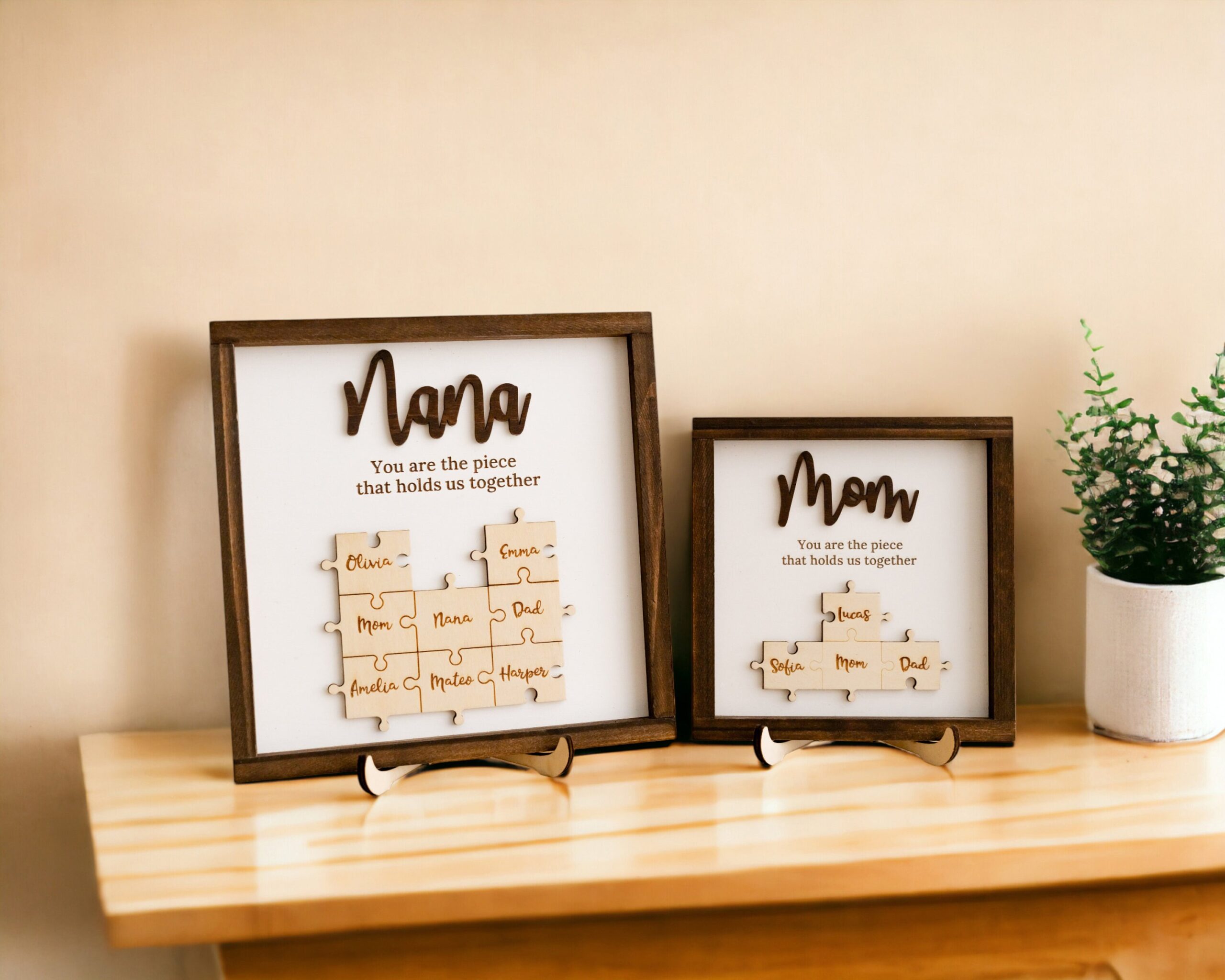 “Mom, you are the piece that holds us together” – This sentiment is showcased on this beautiful custom-made sign. Whether you are gifting for a birthday, Mother’s Day, Christmas, or just because—this handcrafted sign/shelf sitter is sure to be well received by the matriarch in your life. With an intricate black frame, welded onto an elegant scripted “Mom”—the details set this piece apart. Beneath the “Mom” is the phrase “You are the piece that holds us together” engraved onto our faux shiplap backing. Toward the bottom of the sign, the custom engraved puzzle pieces make this gift all the more meaningful. We can include up to 16 puzzle pieces onto the sign. The sign comes with a stand for displaying.